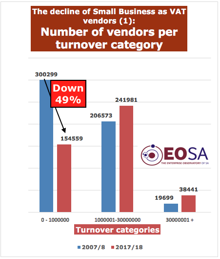 Thanks Marnus. Indeed that factor contributed to the decline, just as graduation to higher turnover categories by some successful companies also played a role. Year by year data of VAT vendors indicate no sudden drop when the threshold was adjusted, rather a constant annual decline. (I’ve added a Figure indicating the year on year change in the article above). Whilst numerous VAT vendors are not companies or close corporations (e.g. sole proprietors or partnerships or trusts) data on Company Income Tax also indicate a drastic decline of small enterprises in numbers, see https://eosa.org.za/2019/04/04/sa-lost-83-000-companies-in-the-financial-business-sector-in-10-years/#more-2264 &https://eosa.org.za/2019/03/24/sa-enterprise-sector-critically-ill/