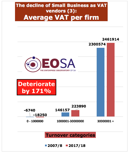 One could argue that the decline by 145 740 small enterprises was on the one hand due to entrepreneurial incompetence and inefficiency and on the other hand contributing to the increase by 54 150 VAT vendors in the larger turnover categories. This decline in numbers has nothing to do with the enterprise churn Schumpeter described as creative destruction. The overall decline rate of 17% in VAT vendors across all turnover categories makes it clear that small businesses are under far more strain than medium and large enterprises.