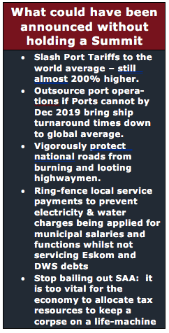 One can only conclude the President and his advisors are still convinced that – apart from addressing State Capture – nothing material has to change and that just more of the same is required, especially grand sounding summits. There was neither an urgency to further policy certainty, nor an inspiring announcement of a package of measures to stimulate growth.