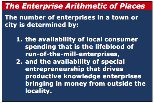 The growth or decline of a city or town is determined by the flow of money into or out of the locality. Enterprises are important generators of income, but the largest percentage of enterprises are mainly aimed at servicing local consumer needs, therefore feeding primarily off money already in the locality. EOSA refers to such enterprises as run-of-the-mill enterprises. The majority of businesses belong to such categories.