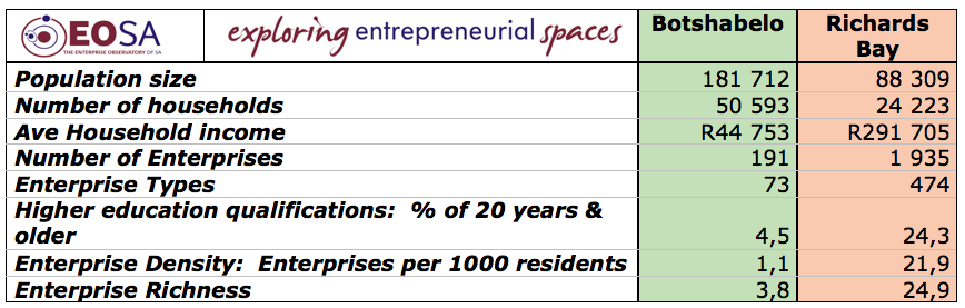 Richards Bay’s Enterprise Density (the number of enterprises per 1 000 of the population) is 21.9 compared to Botshabelo’s 1.1. The Enterprise Richness (measuring enterprise differentiation) of 24.9 is also 6.5 times more diverse than that of Botshabelo.