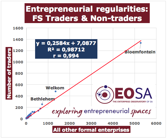 Analyses of EOSA’s unique enterprise data base of formal enterprises in more than 400 SA cities and towns, reveal extremely strong regularities at work in these enterprise sectors. In fact, in some of these sectors the correlation is so strong that it has predictive potential. The number of traders – whether a Shoprite, Pick & Pay or Spar or the independent corner café – in a locality is extremely significantly correlated to the overall number of all non-trader businesses in that locality.