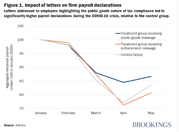 The letters were sent out end February, with Albania implementing a lockdown mid-March that ended only at the end of May. This makes Albania the first laboratory testing the behavioural action of tax payers affected by lockdown. The result (Figure 1) reveals significantly higher payroll declarations in response to the public goods message than in the case of threats.