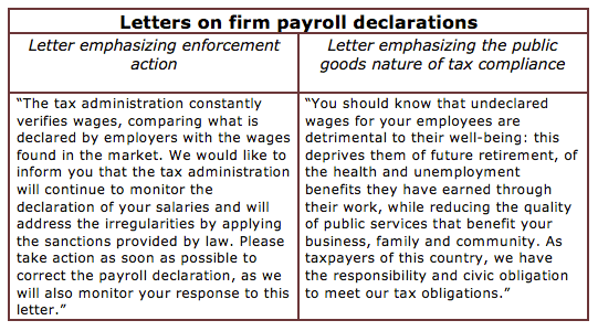 The tax administration selected a sample of businesses suspected of under-declaring payrolls and designed letters with two different types of messages to be sent to the firms. The one highlighted the public goods nature of truthful payroll declarations and the other threatened enforcement actions if caught out committing tax fraud. Both letters were designed to gain behavioural insights and the randomly assigned firms were divided into three groups: a treatment group receiving the enforcement message, a treatment group receiving the public goods message, and a control group not receiving any letter.