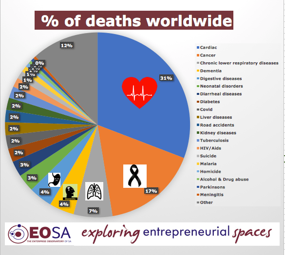 If the worldwide death toll of 1.359 million attributed to Covid-19 is divided by the daily average global death toll of 158 085 (for 2019) and one fills the annual calendar according to deaths by cause, the feared pandemic with its vicious waves is closer to a ripple than a tsunami. EOSA developed a Cause of Death Calendar that shows: