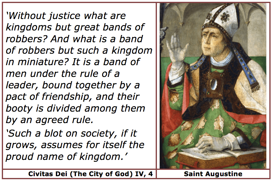 One recalls the words of Saint Augustine, bishop of Hippo Regius in North Africa, whose theology and philosophy influenced ancient as well as modern thought: “Without justice, what are kingdoms but great bands of robbers?”